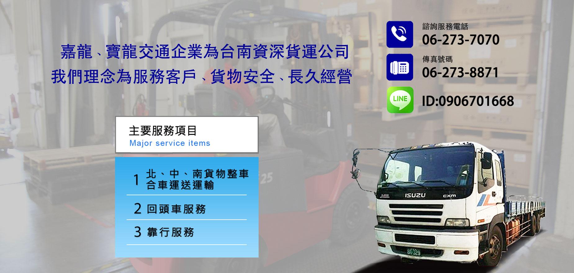 臺(tái)南嘉龍貨運(yùn)多年來(lái)以誠(chéng)信為原則,將合理價(jià)格、顧客信賴(lài)為經(jīng)營(yíng)宗旨,來(lái)為顧客服務(wù),目前以貨品運(yùn)送為主要營(yíng)運(yùn)項(xiàng)目,提供北中南大宗貨運(yùn)服務(wù),且擁有多輛的貨車(chē)、回頭車(chē),每次發(fā)車(chē)皆以顧客貨物能安全準(zhǔn)時(shí)送達(dá)為標(biāo)準(zhǔn),秉著永續(xù)經(jīng)營(yíng)與顧客創(chuàng)造雙贏(yíng)為目標(biāo),提供顧客在貨物運(yùn)輸上安心的選擇。
